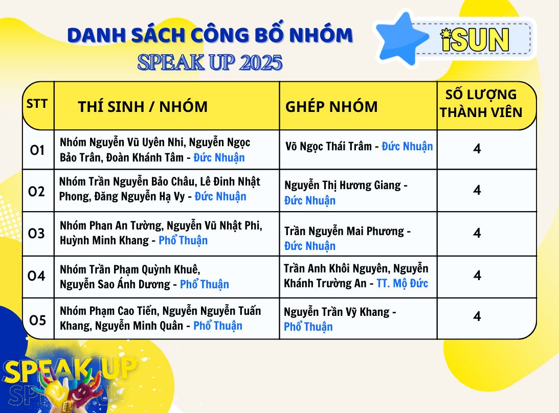VÒNG CHUNG KẾT SPEAK UP mùa 3 năm 2025 sẽ tổ chức hình thức thi theo nhóm, vì vậy các thí sinh thi cá nhân sẽ được xếp vào nhóm để chuẩn bị cho vòng chung kết. Dưới đây là DANH SÁCH CÔNG BỐ NHÓM các thí sinh được vào chung kết: