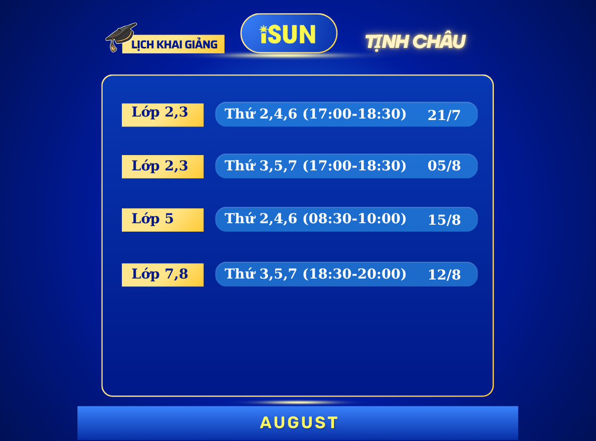 iSUN xin gửi đến Quý phụ huynh Lịch khai giảng tháng 8 tại 6 cơ sở của iSUN