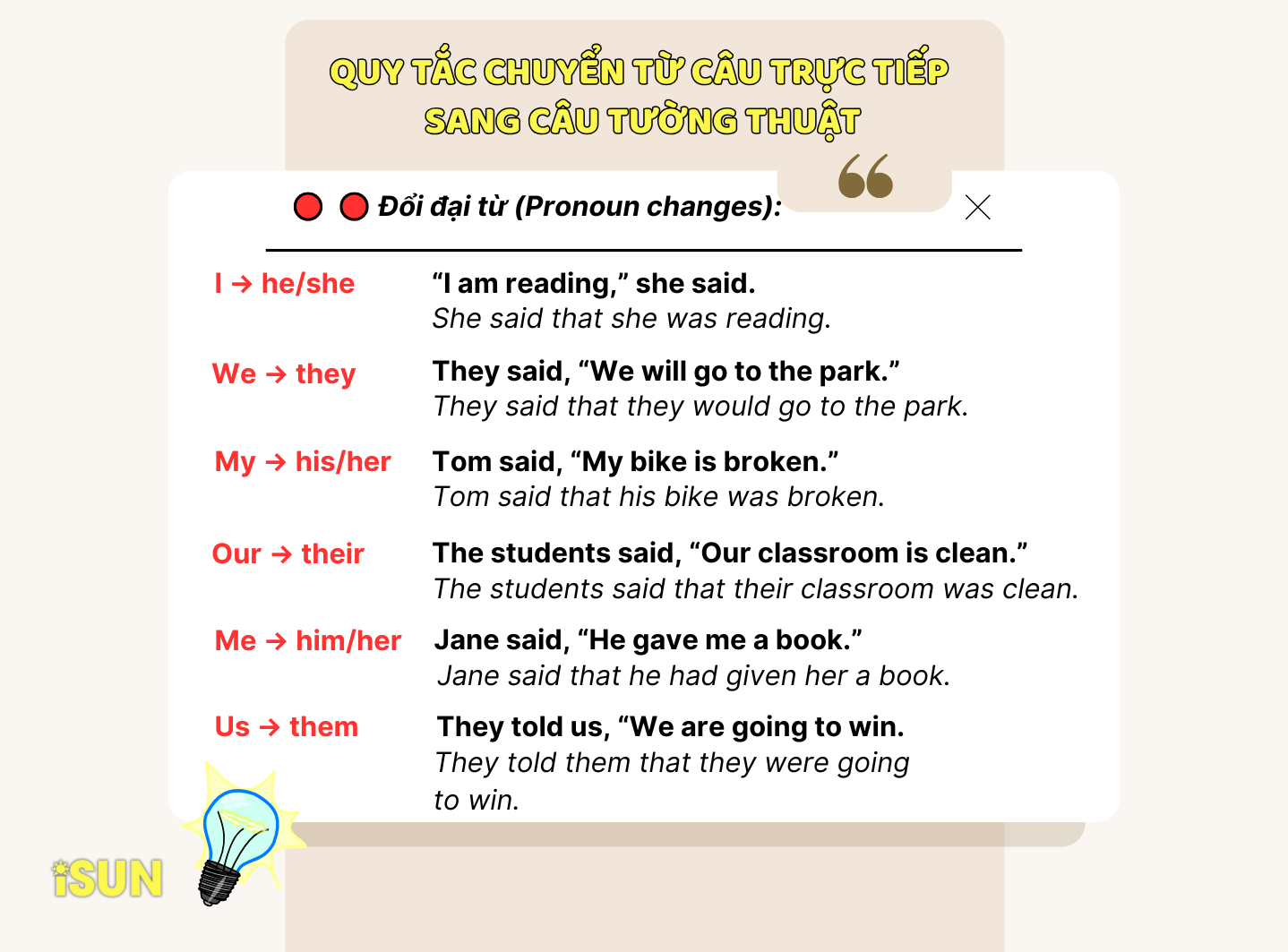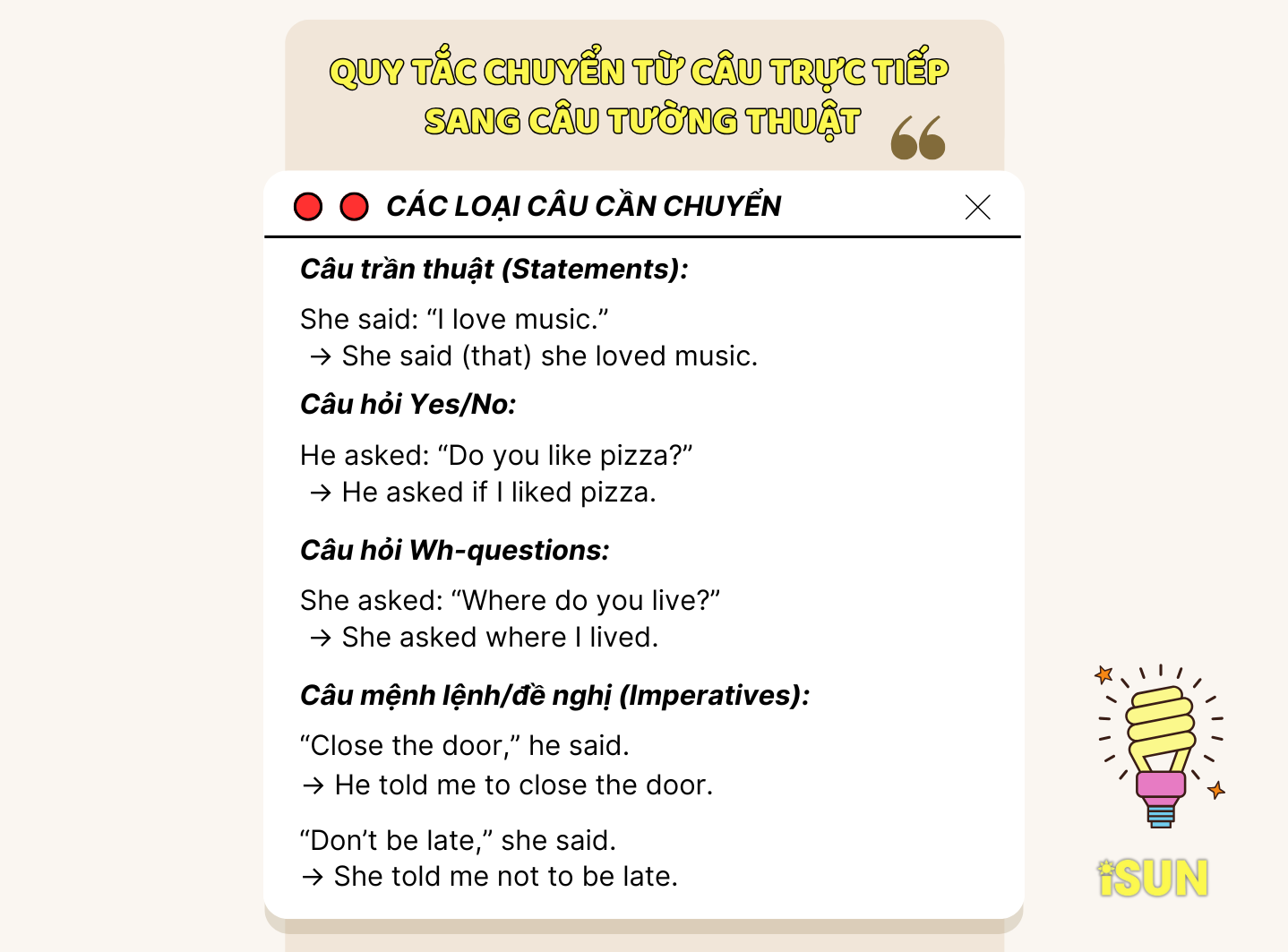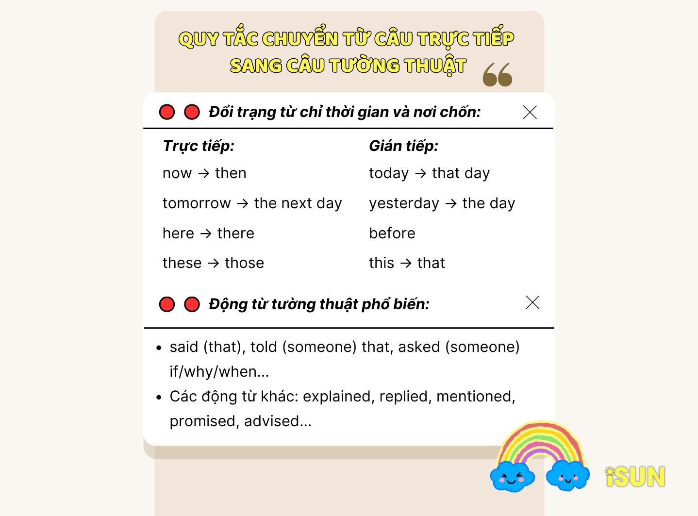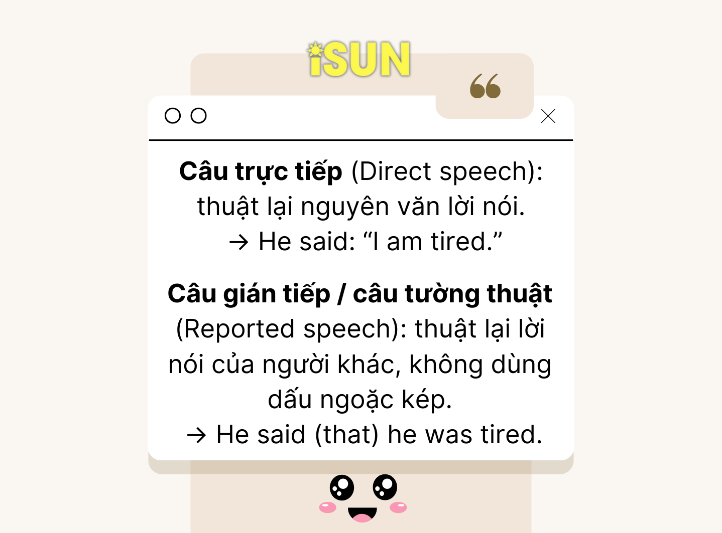 Câu tường thuật là cách kể lại lời nói hoặc suy nghĩ của người khác một cách gián tiếp, thay vì nhắc lại nguyên văn.