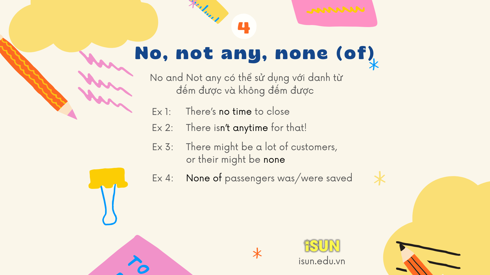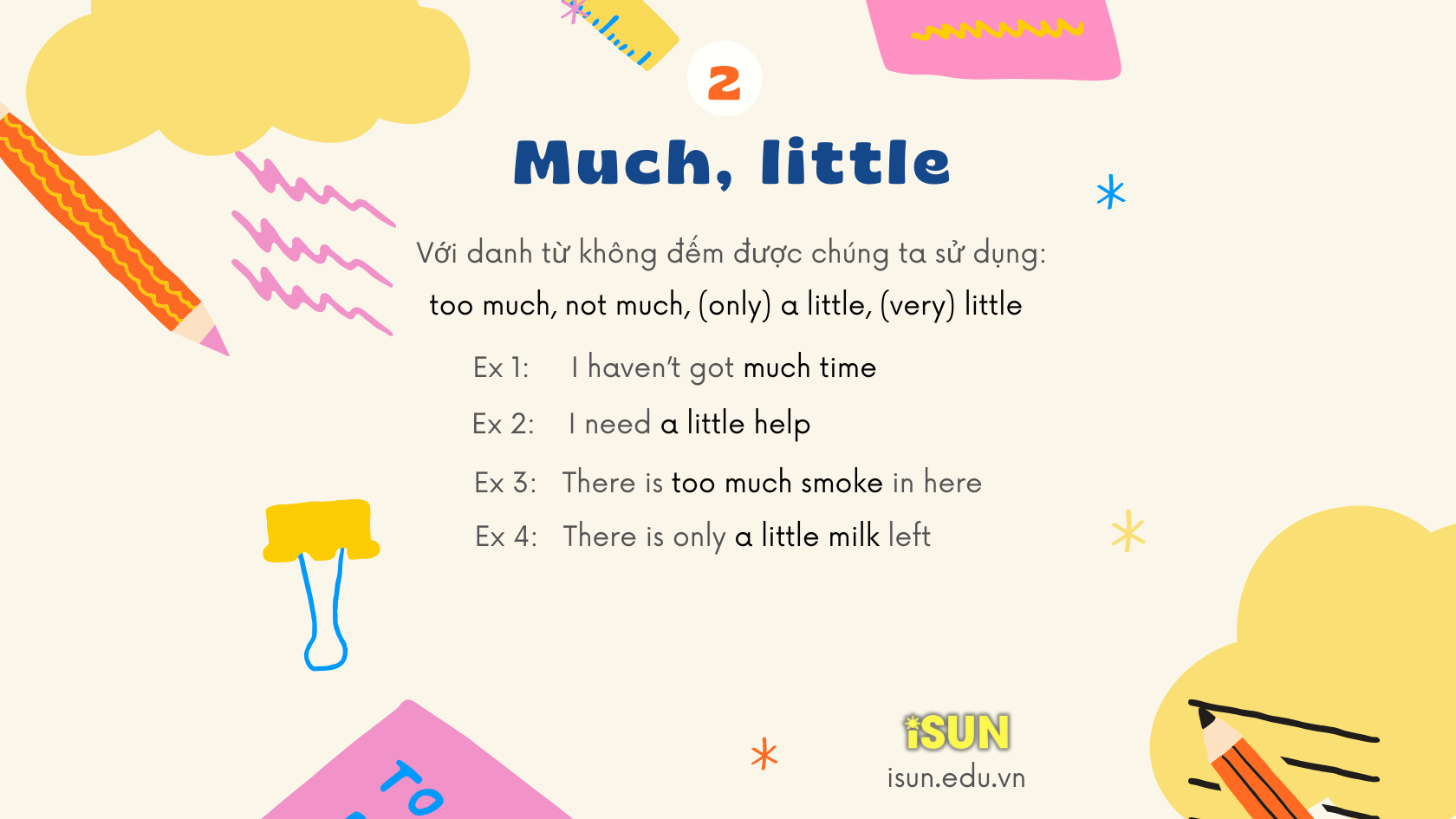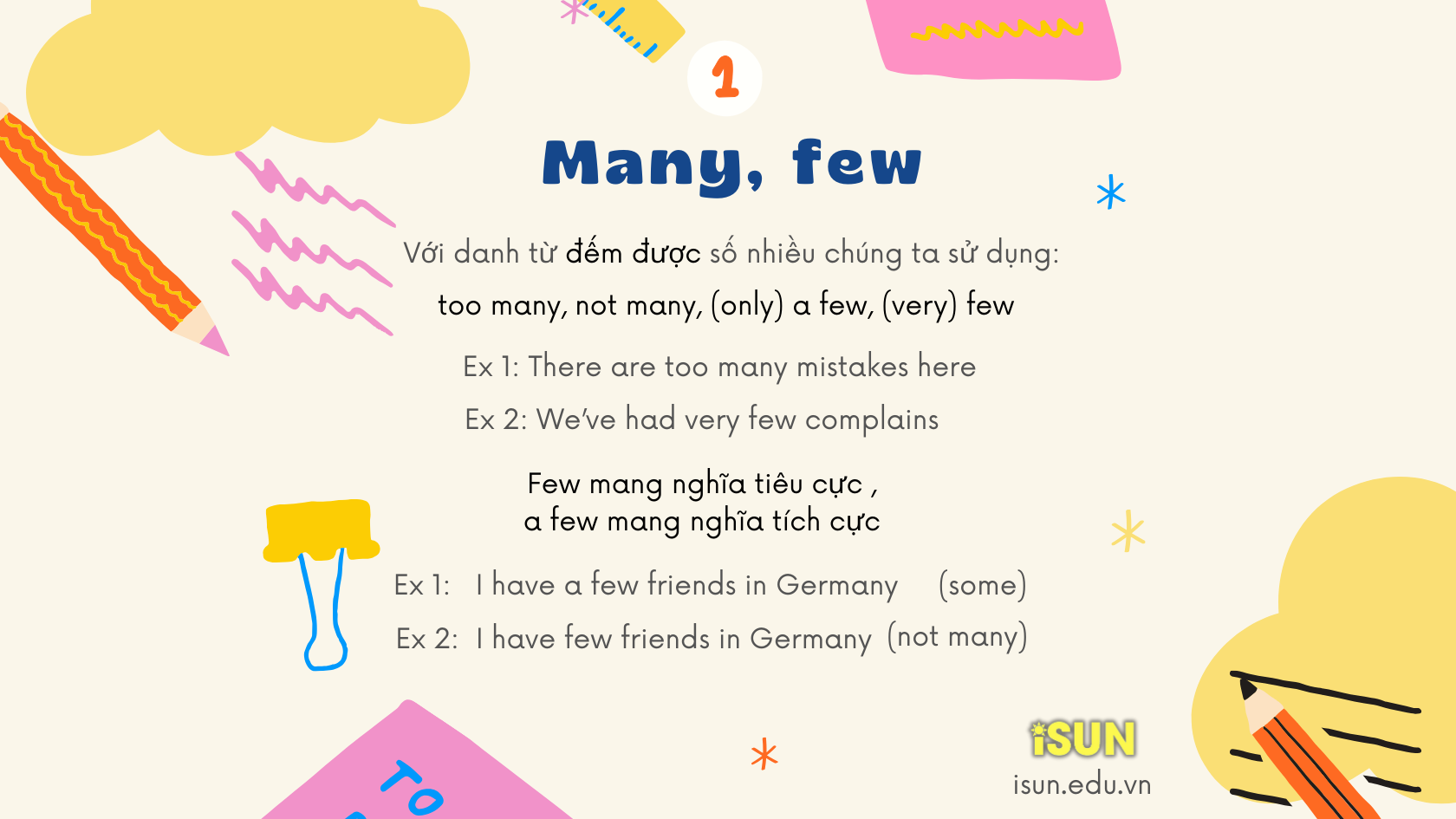 Chúng ta cùng nhau ôn tập lại các lượng từ phổ biến như: many, much, a lot of, a few, a little, any … và cách sử dụng đúng lượng từ theo danh từ đếm được/ không đếm được.