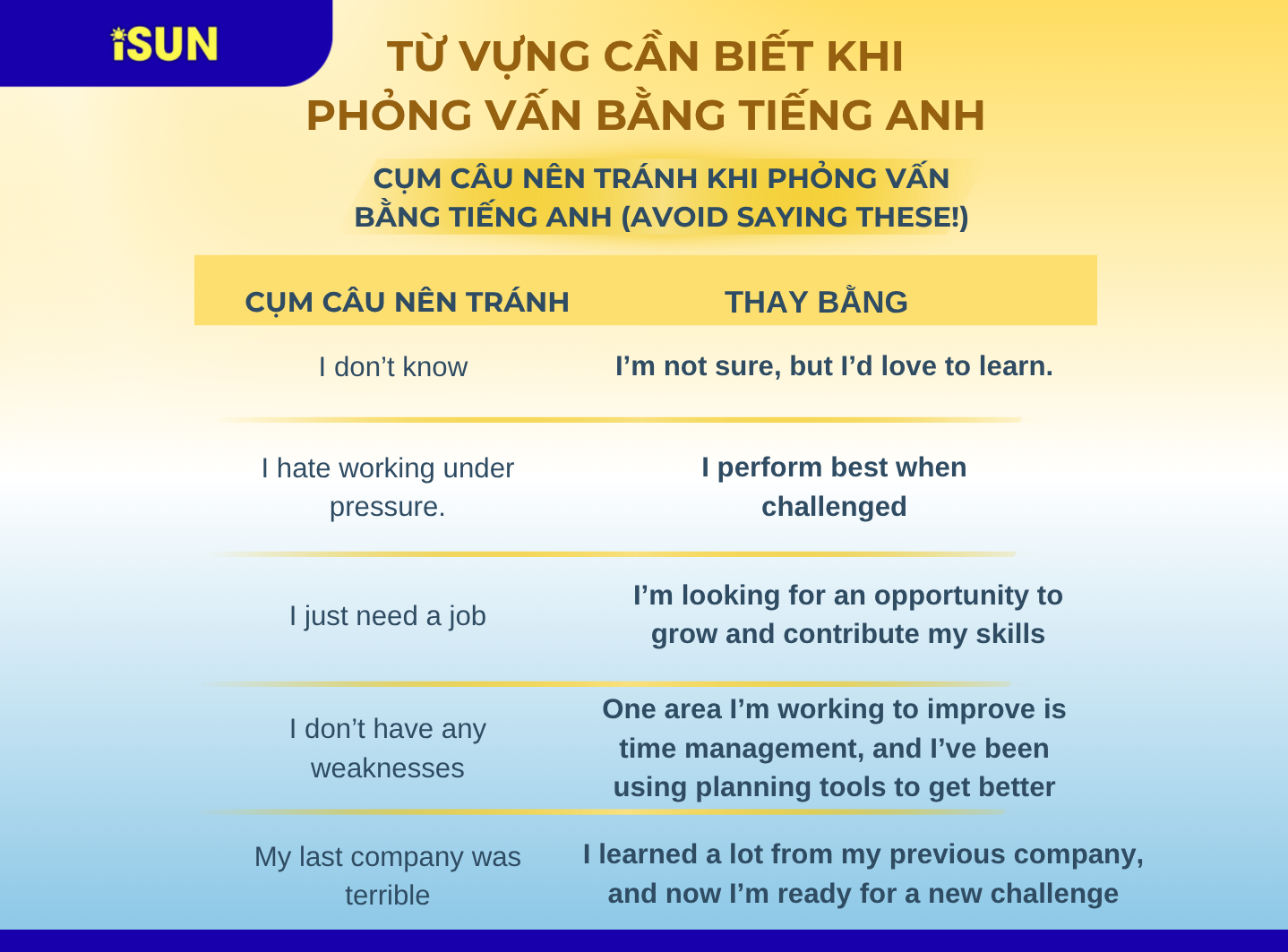Bài viết này sẽ giúp bạn nắm vững từ vựng và cụm từ thường gặp trong phỏng vấn, đồng thời biết những cách diễn đạt nên tránh để tạo ấn tượng tốt ngay từ đầu.