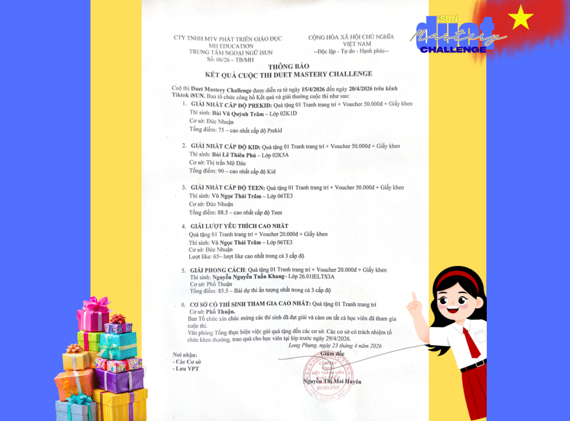 Ban Tổ chức xin chúc mừng các thí sinh đã đạt giải, đồng thời trân trọng cảm ơn tất cả học viên đã tham gia cuộc thi. Hy vọng qua sân chơi này, các bạn không chỉ vượt qua chính mình, rèn luyện kỹ năng tiếng Anh mà còn tự tin thành thạo công nghệ Duet. Hẹn gặp lại trong những cuộc thi sắp tới!