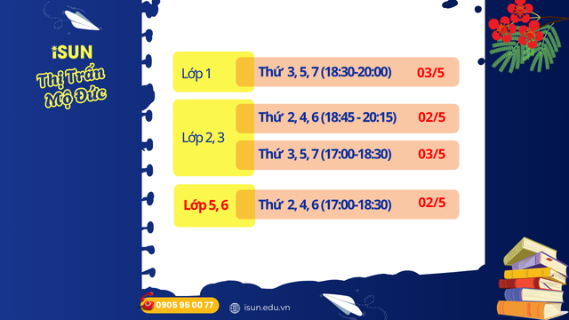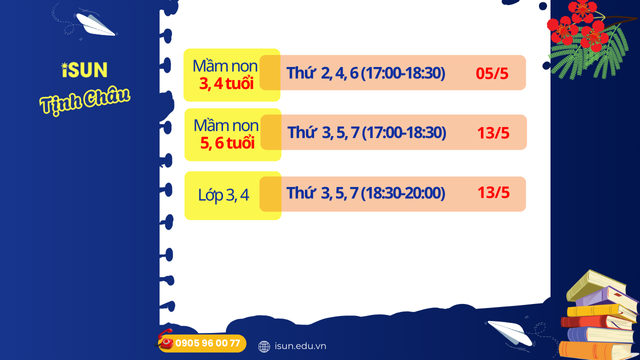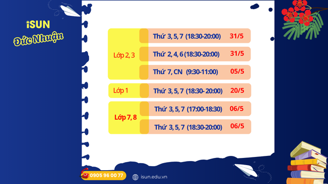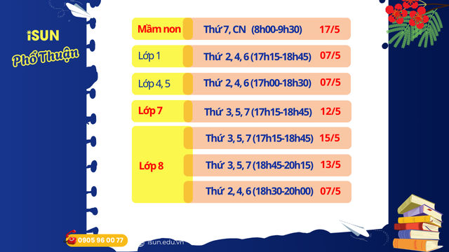 Hiểu được nhu cầu này, iSUN khai giảng các khóa học tiếng Anh đa dạng trong tháng 5, giúp học viên xây dựng nền tảng vững chắc, nâng cao kỹ năng và bứt phá trong học tập. Đăng ký ngay hôm nay để tận dụng thời gian hè thôi nào!