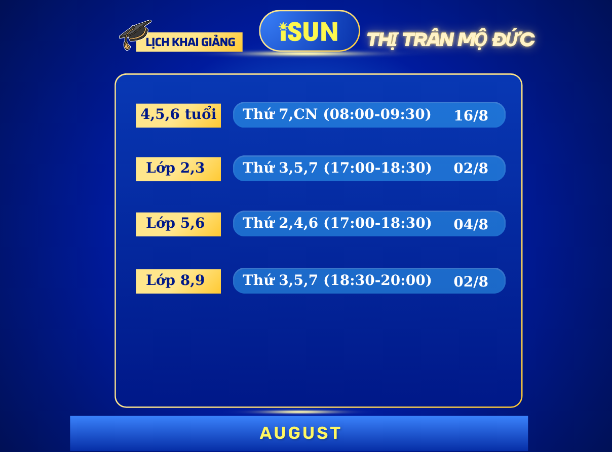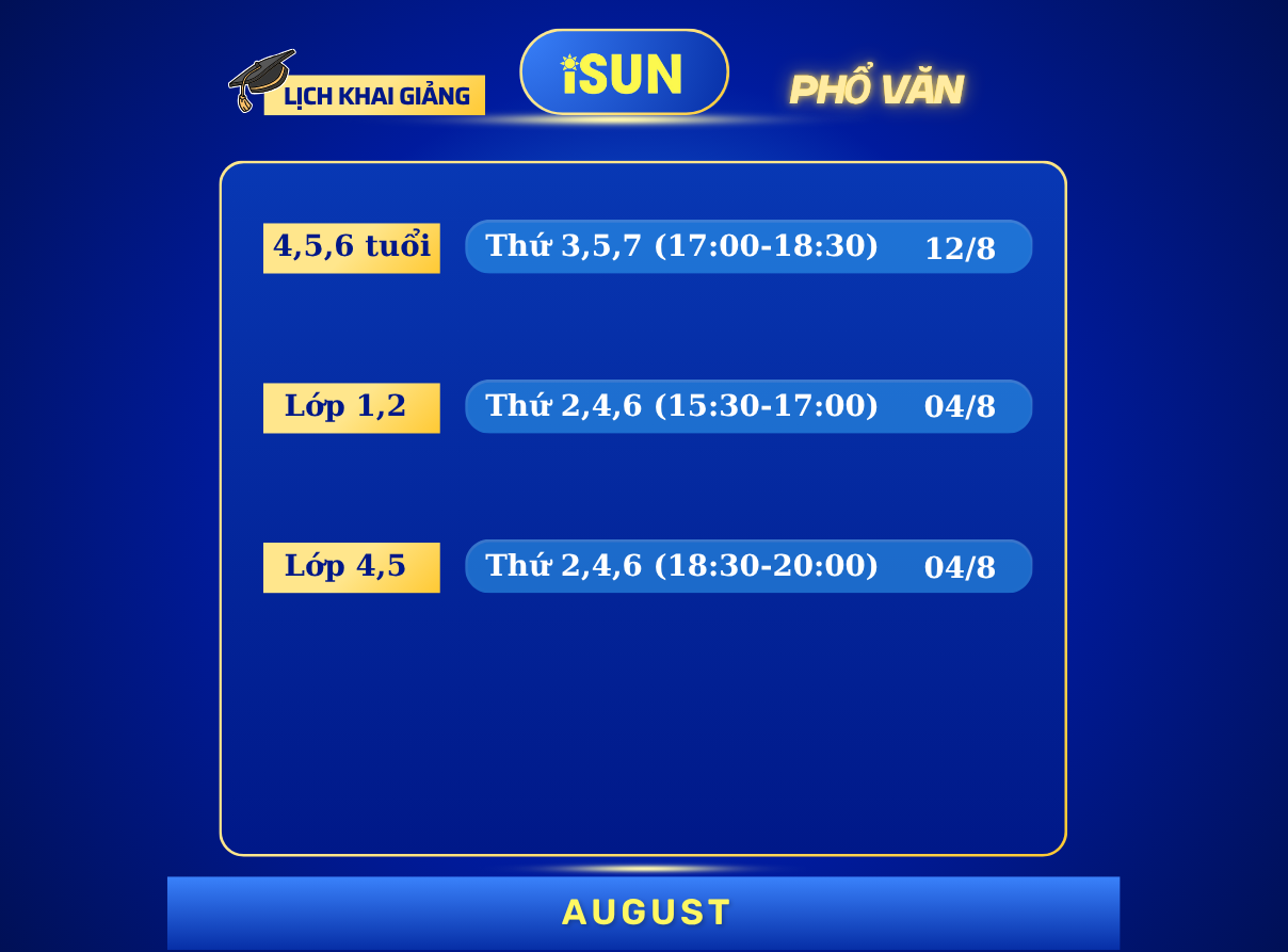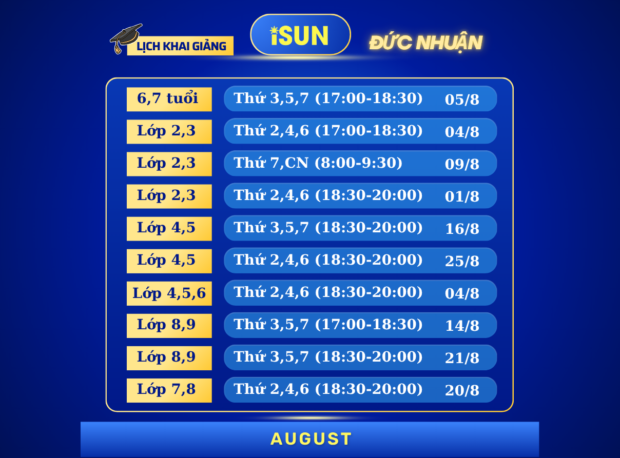 iSUN xin gửi đến Quý phụ huynh Lịch khai giảng tháng 8 tại 6 cơ sở của iSUN