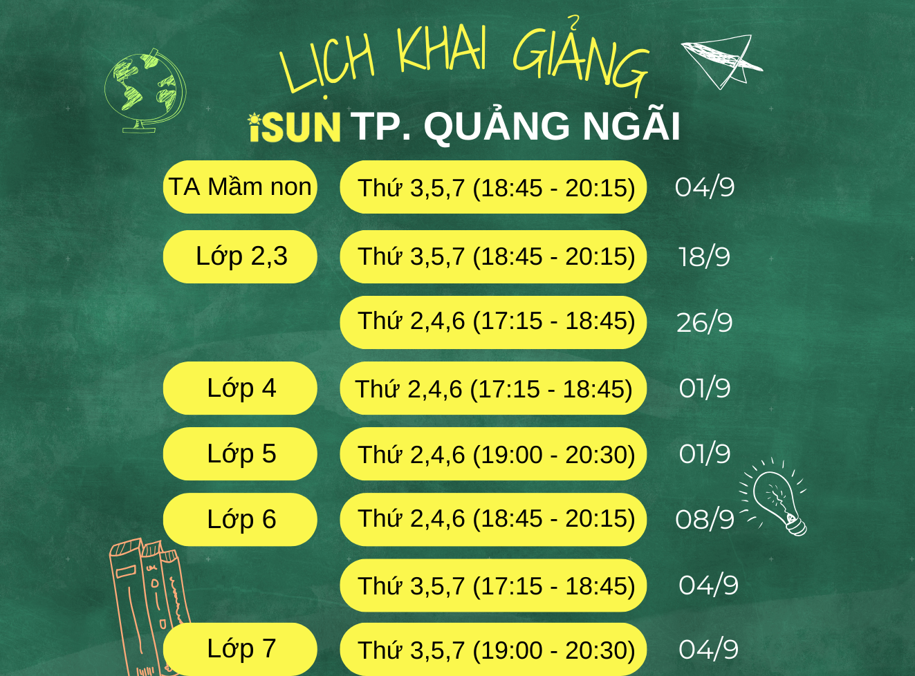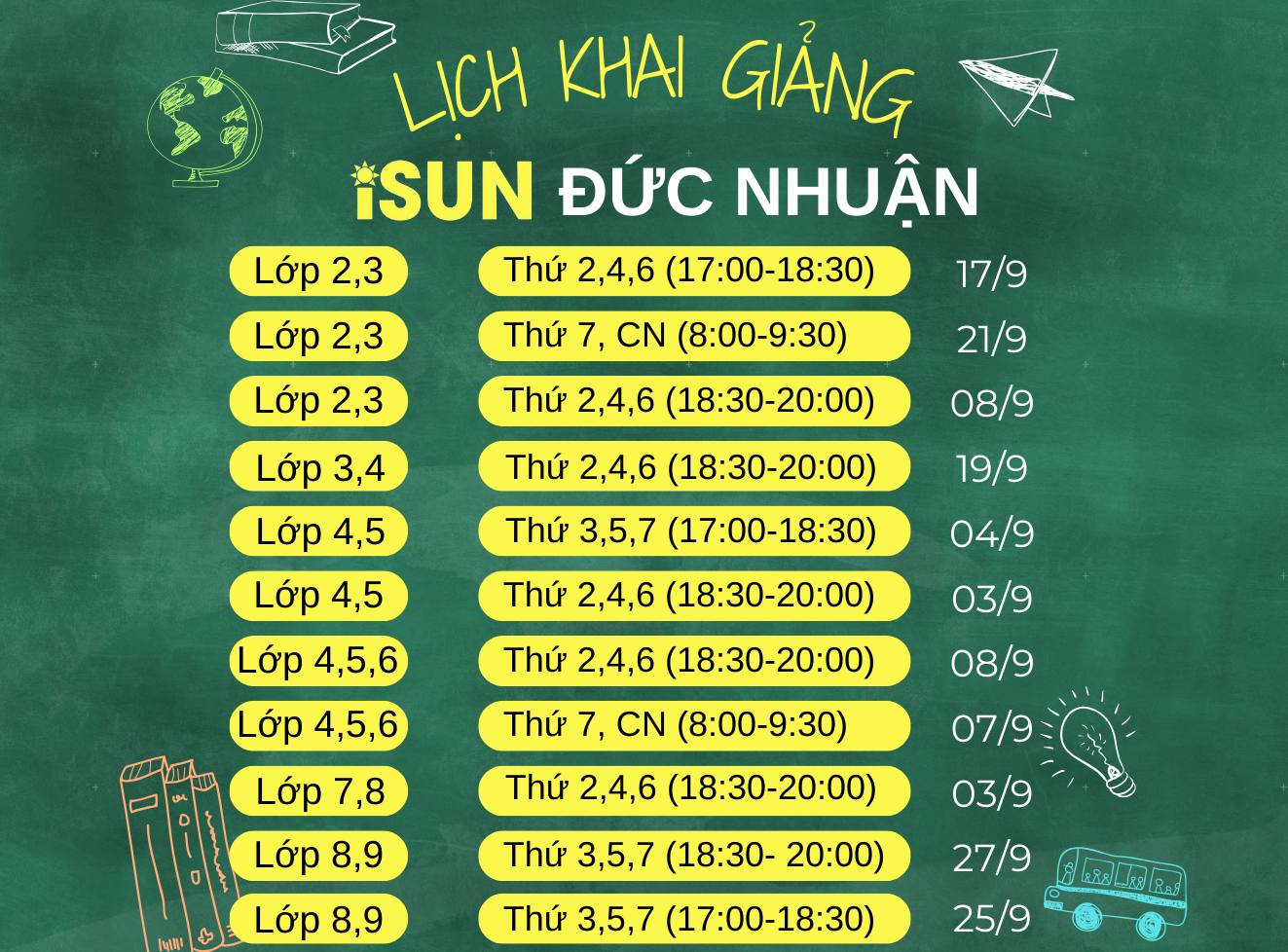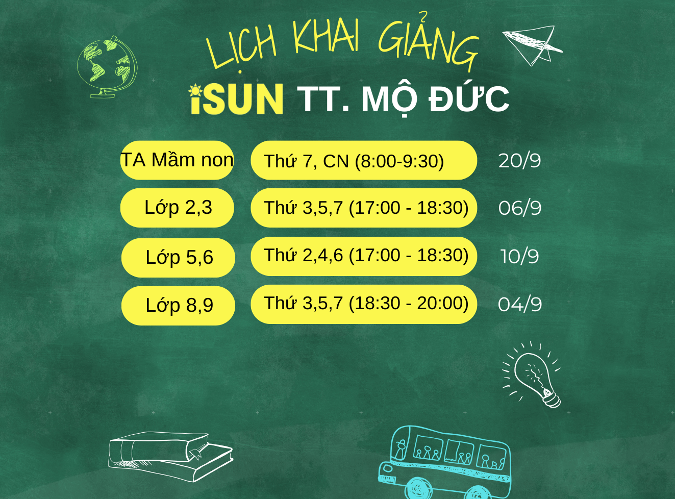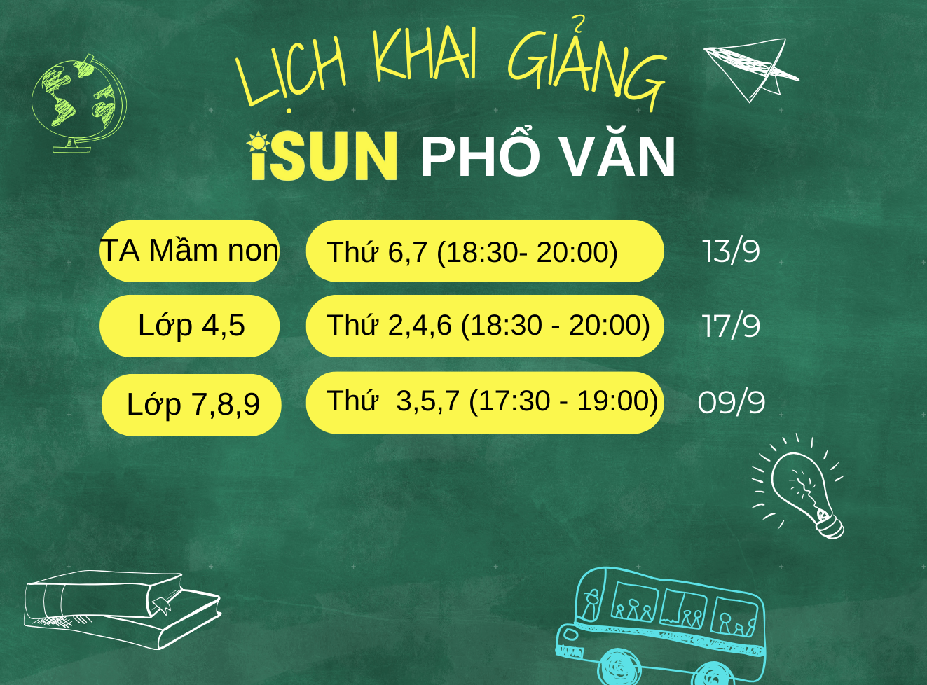 Một mùa tựu trường nữa lại về, mang theo không khí rộn ràng, háo hức của thầy cô và học sinh trên khắp cả nước. Trung tâm ngoại ngữ iSUN hân hoan thông báo LỊCH KHAI GIẢNG THÁNG 9 với nhiều hoạt động hấp dẫn, chương trình học được cập nhật theo xu hướng mới, phù hợp với từng lứa tuổi và trình độ.